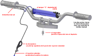 El aceite se almacena en el tanque "C", instalado en el manillar de la moto. Puedes variar la cantidad de aceite administrado, en función de si usas dos, tres o cuatro dedos para accionar la bomba. |