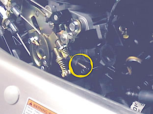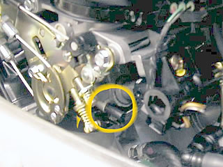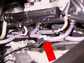 | 2003: La conexión al vacío Instalar la pieza "T" en el tubo al "check valve". (En el lado negro, NO el amarillo). La motos mas recienes tienen un tubo de vacío al "airbox" (detrás, a la izquierda) |