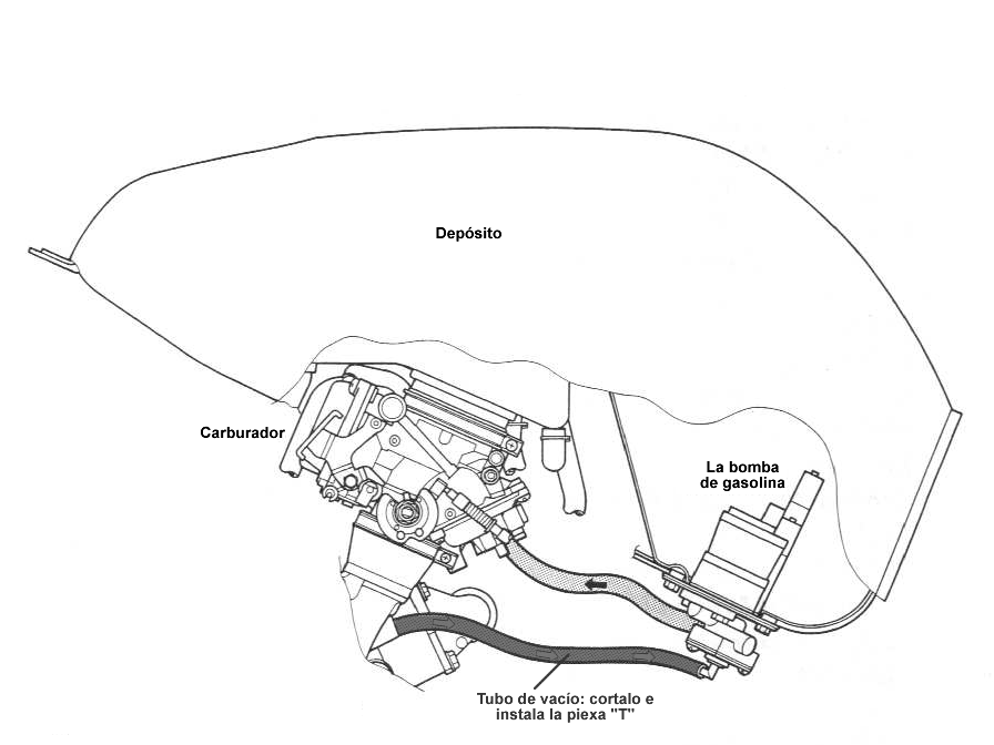 | Conexión al vacío: instala la pieza "T" en el tubo entre el grifo del depósito y la culata (tobera #3) | |