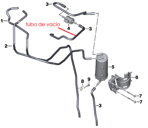 vSystem - La conexión al vacíoLa F750GS tiene un sistema EVAP para controlar las emisiones. Hay un tubo de vacío entre la tobera de admisión y la válvula anti-retorno como muestra el esquema de la derecha. Se instale el conector "T" 6mm RM-150250BL en el tubo indicado. Esta pieza "T" 6mm no está incluido en el vSystem por defecto. |