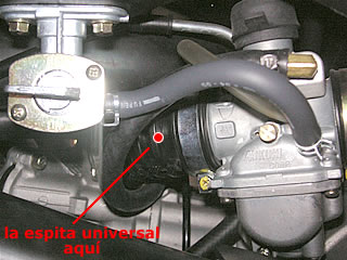 | La conexión al vacío Si el grifo de un depósito tiene una posición marcada como "PRI", significa que hay una conexión al vacío del motor. Sin embargo, en este modelo, que estaba expuesto en una feria de motos, faltaba el tubo. Si los modelos actuales carecen de este tubo, será necesario taladrar la goma de la tobera de admision e instalar la espita universal que viene en en kit. |